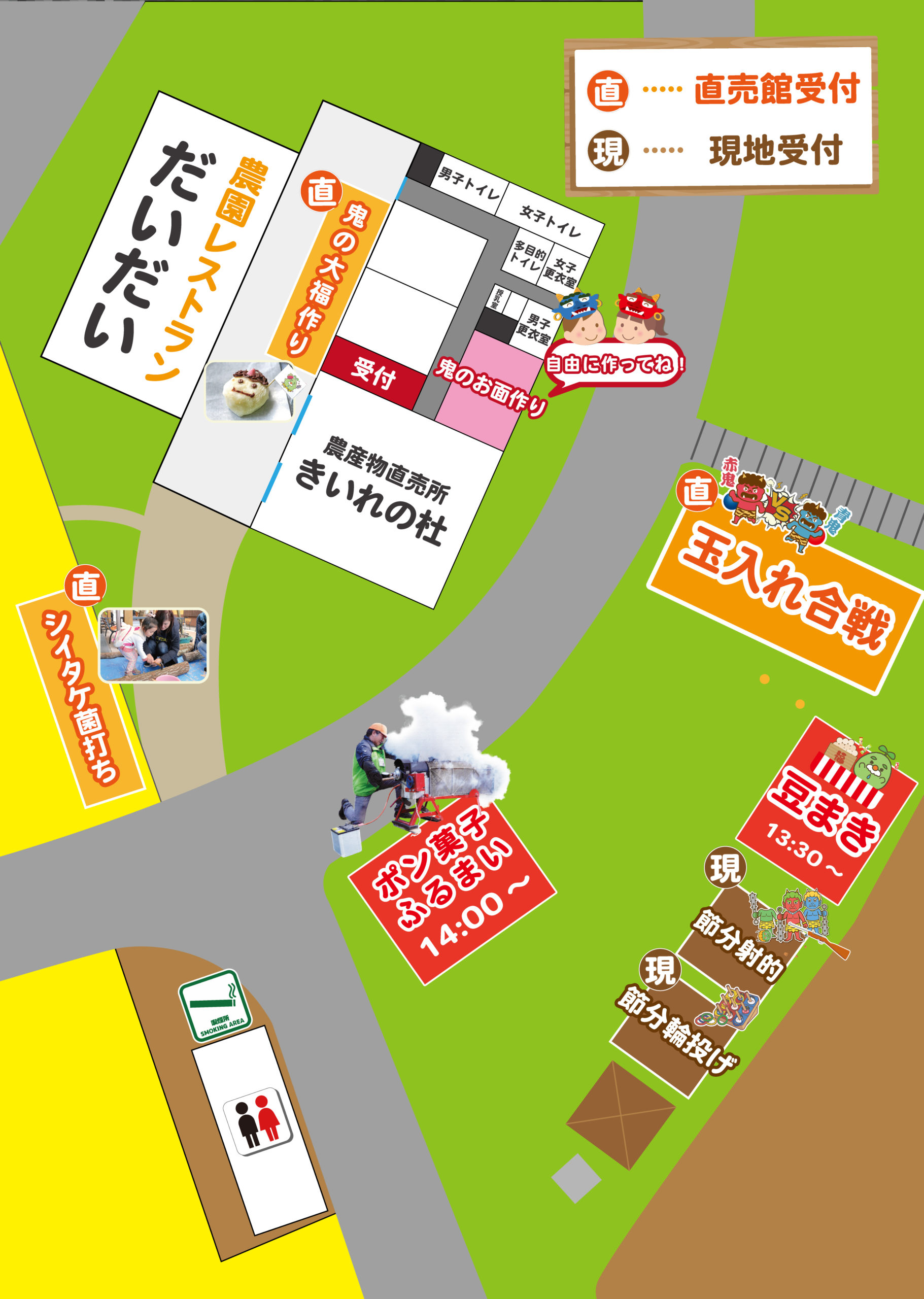 農産物直売館横の公園(F-PARCO)で豆やお菓子をまきます。